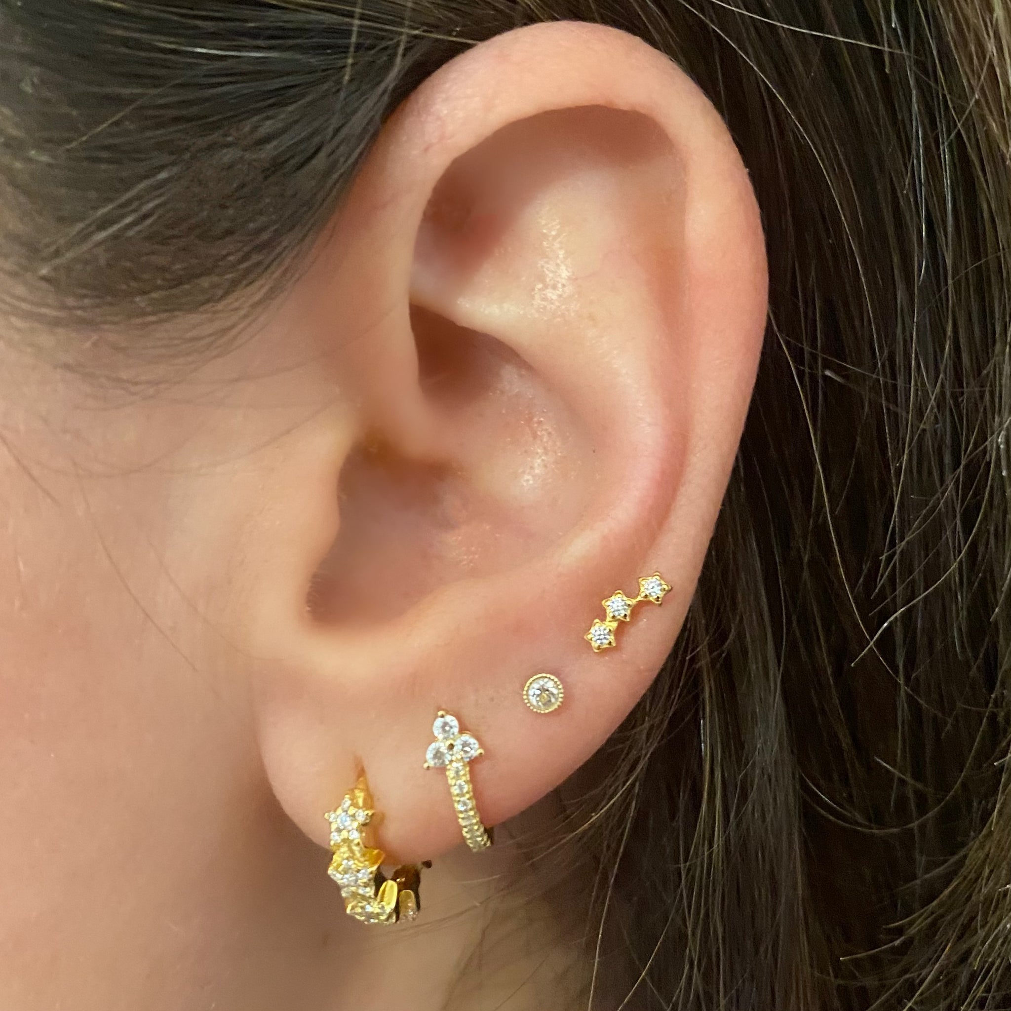 Our ALICE huggie hoop earring is one of our best sellers. This elegant and dainty huggie has a trio cluster design which can take your look from day to night.