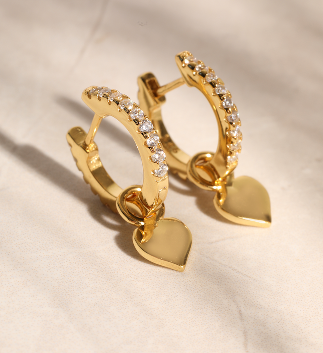 Our DAISY earring features a heart charm that drops from an elegant, cubic zirconia encrusted hoop designed to hug around the earlobe. A sparkling addition to your stack!